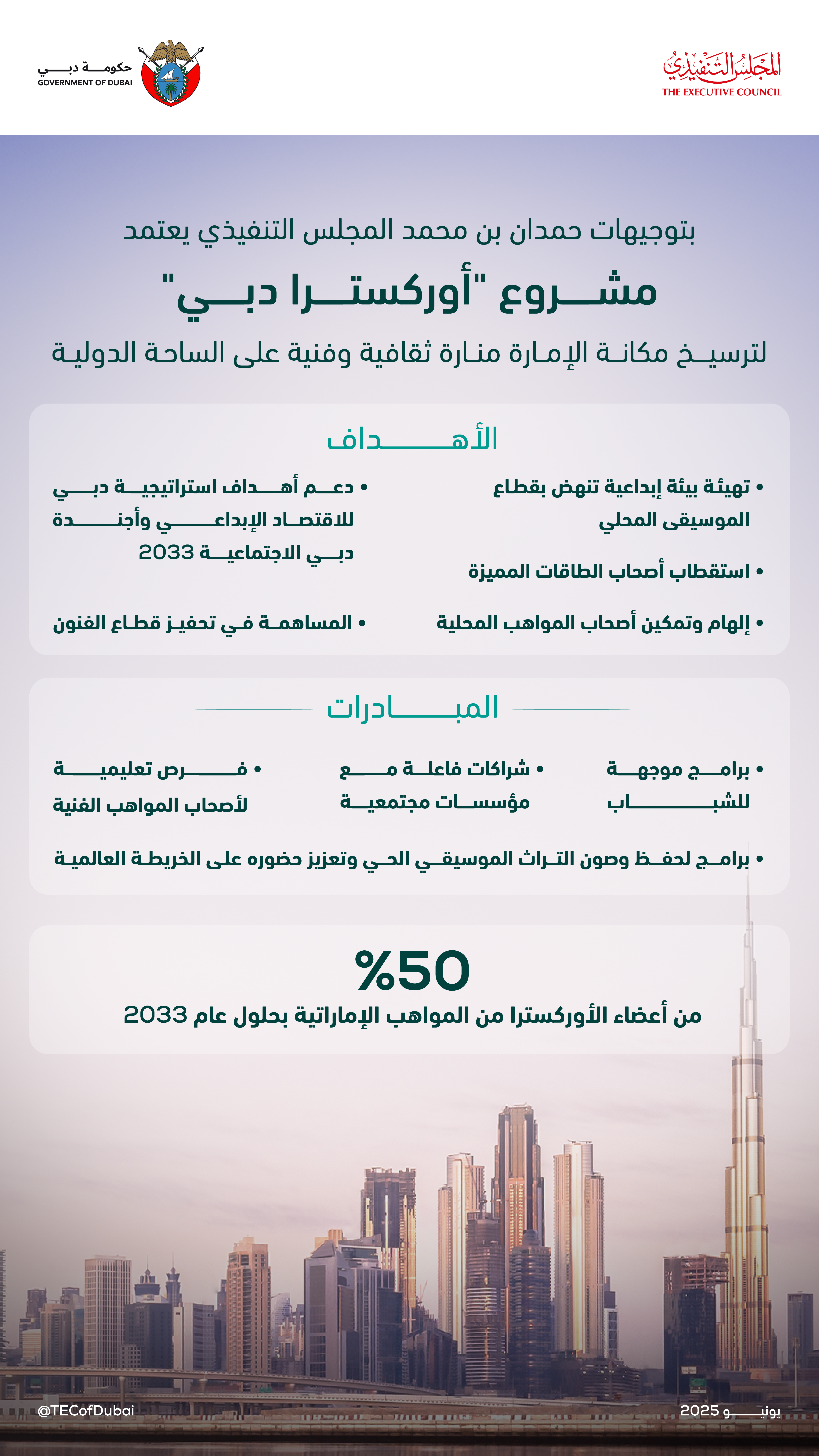 بتوجيهات سمو الشيخ حمدان بن محمد بن راشد آل مكتوم، ولي عهد دبي، نائب رئيس مجلس الوزراء وزير الدفاع، رئيس المجلس التنفيذي لإمارة دبي، اعتمد المجلس التنفيذي مشروع "أوركسترا دبي" الهادف إلى تعزيز حضور الفنون والثقافة الإماراتية على الخريطة العالمية، وترسيخ مكانة دبي مركزاً عالمياً للثقافة، وحاضنة للإبداع، وملتقى للمواهب، ورفع كفاءة القطاع الفني في دبي، ودعم أصحاب المواهب المحلية الواعدة.