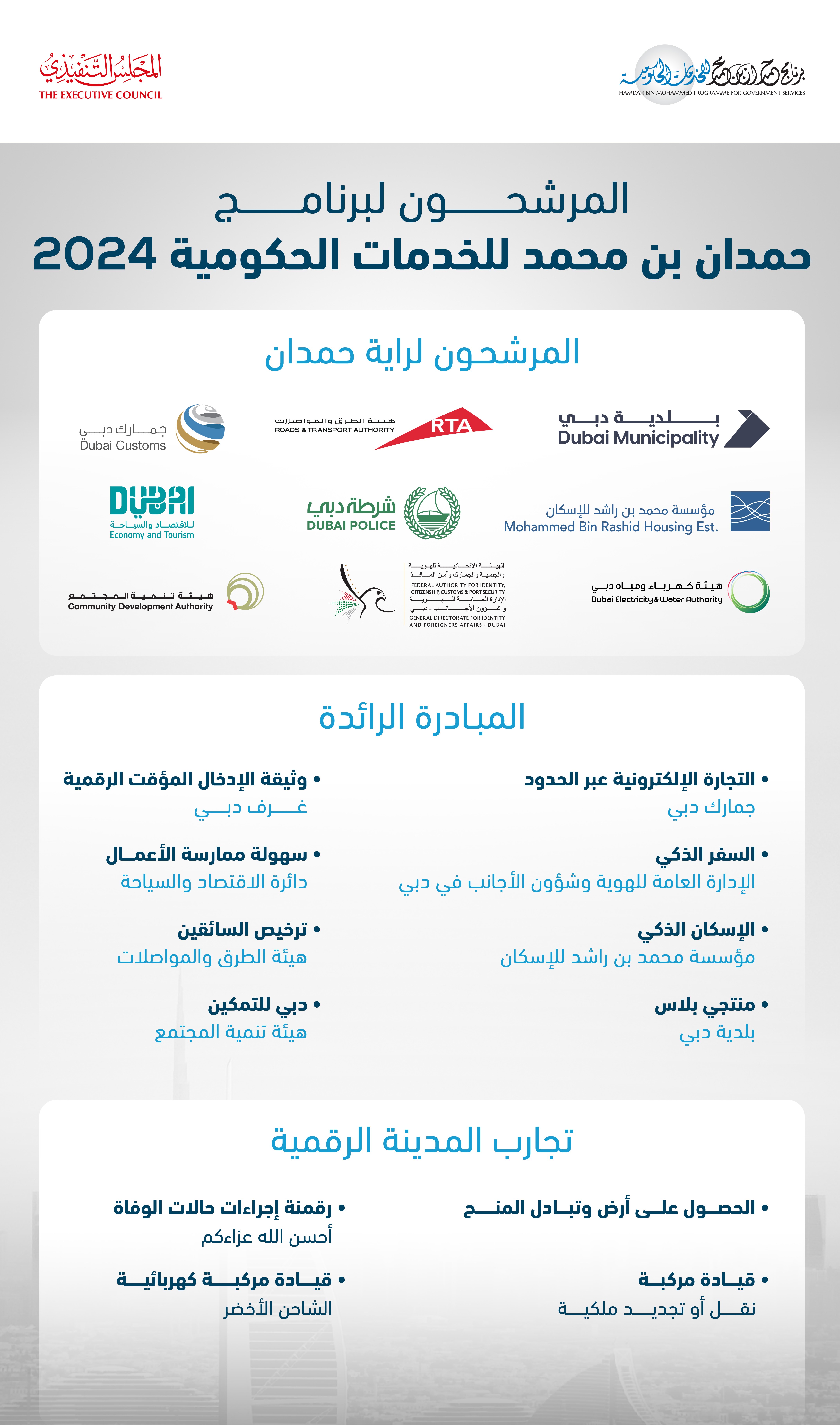 أعلن "برنامج حمدان بن محمد للخدمات الحكومية"، التابع للأمانة العامة للمجلس التنفيذي لإمارة دبي، قائمة الجهات الحكومية التي وصلت إلى المرحلة النهائية في منافساتها على الجوائز الثلاثة ضمن "برنامج حمدان بن محمد للخدمات الحكومية"، وهي "راية حمدان"، و"أفضل مبادرة رائدة"، و"أفضل تجربة مدينة رقمية" وذلك بعد تحقيقها أفضل النتائج في تطوير تجارب المتعاملين والارتقاء بنوعية وكفاءة الخدمات بمعايير عالمية وفق سياسة "خدمات 360"، بما يعزز ريادة دبي عالمياً في مجال ابتكار خدمات وتجارب ومبادرات حكومية تشكل نموذجاً عالمياً يحتذى به.
