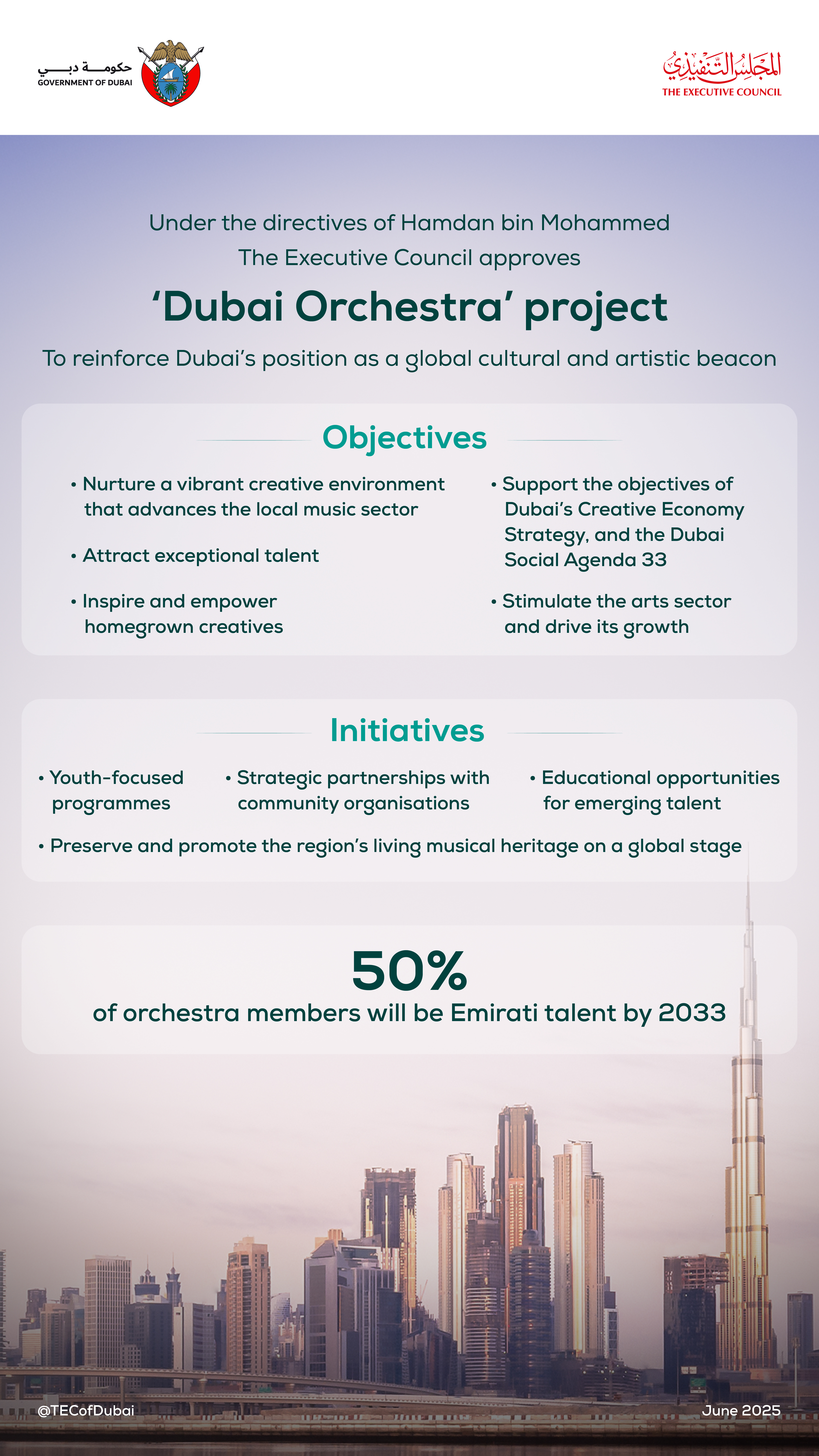 The ‘Dubai Orchestra’ project seeks to nurture a vibrant creative environment that advances the local music sector, attracts exceptional talent, and empowers homegrown creatives to pursue their passion while enriching Dubai’s musical landscape. It aligns with the objectives of Dubai’s Creative Economy Strategy and the Dubai Economic Agenda D33, which aims to position the emirate among the world’s top three urban economies; it also supports Dubai Culture’s mandate and sectoral priorities to strengthen the city’s cultural and creative industries.
