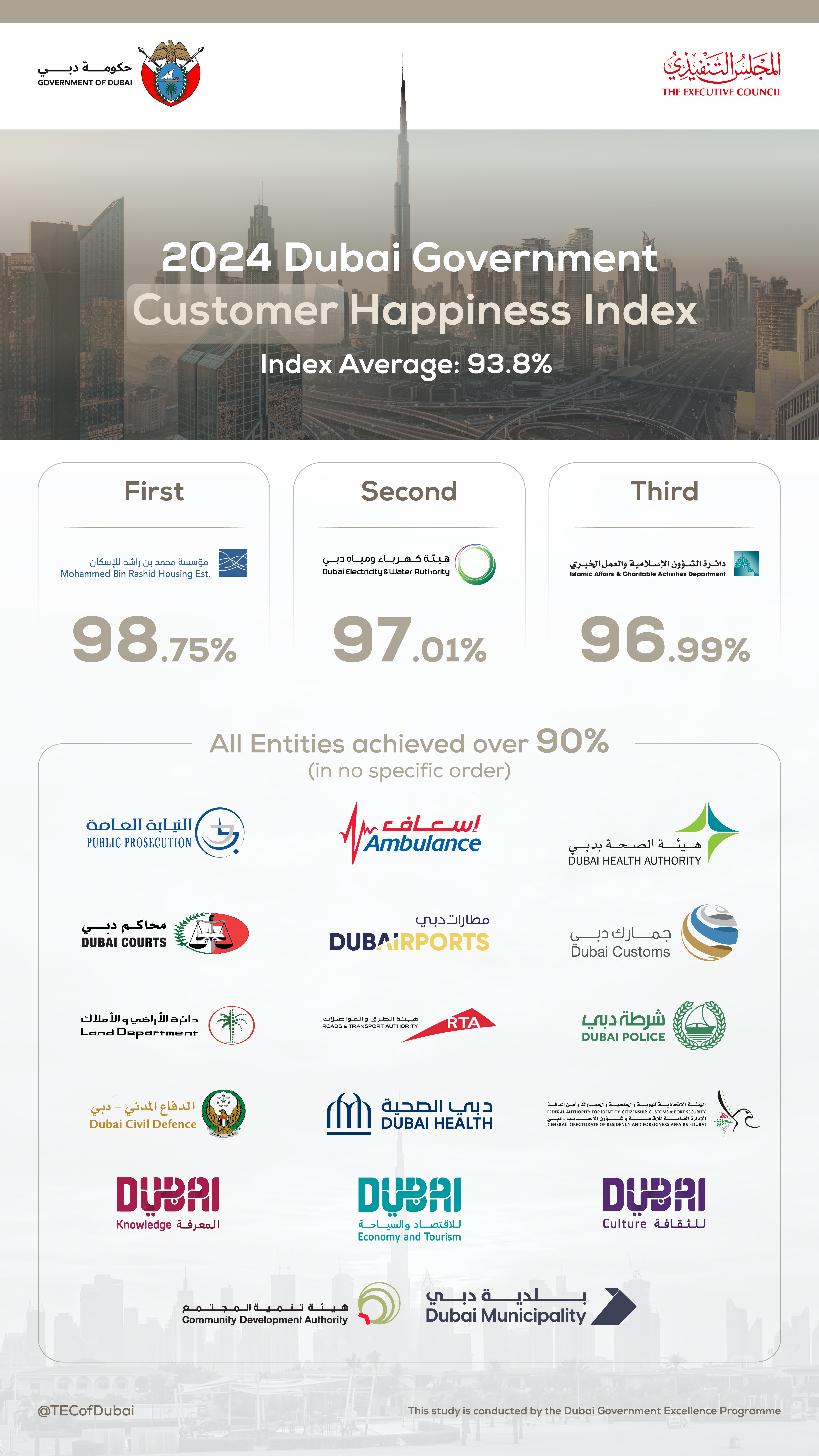 The report, issued annually by the Dubai Government Excellence Programme (DGEP), part of the General Secretariat of The Executive Council of Dubai, revealed that Dubai government entities achieved an average customer happiness rating of 93.8%, an employee happiness rating of 86.7%, and a Mystery Shopper score of 95.8%.