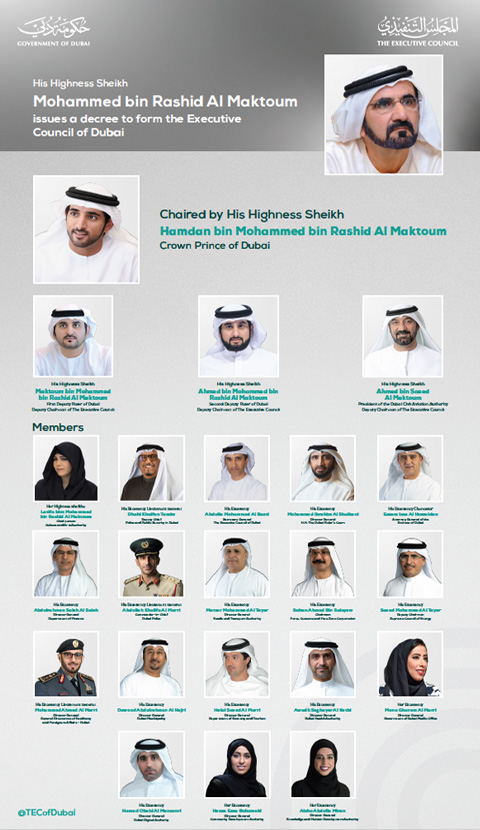According to Decree No. (14) of 2024, members of the TEC include: Her Highness Sheikha Latifa bint Mohammed bin Rashid Al Maktoum, Chairperson of the Dubai Culture and Arts Authority (Dubai Culture), His Excellency Lieutenant General Dhahi Khalfan Tamim, Deputy Chief of Police and Public Security, in addition to the Secretary General of The Executive Council of Dubai, Director General of HH the Ruler's Court, Attorney General of Dubai Public Prosecution, Director General of the Department of Finance, Commander-in-Chief of Dubai Police, Director General of the Roads and Transport Authority, Chairman of Ports, Customs and Free Zone Corporation, Vice Chairman of the Supreme Council of Energy, Director General of the General Directorate of Residency and Foreigners Affairs - Dubai, Director-General of Dubai Municipality, Director General of Dubai’s Department of Economy and Tourism, Director General of the Dubai Health Authority, Director General of the Government of Dubai Media Office, Director General of the Dubai Digital Authority, Director General of the Community Development Authority, and Director General of the Knowledge and Human Development Authority.