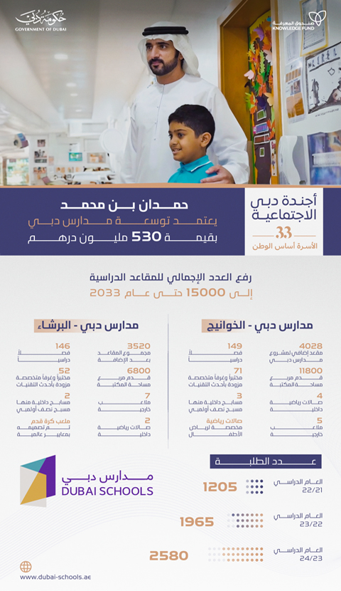 في إطار "أجندة دبي الاجتماعية 33" التي أطلقها صاحب السمو الشيخ محمد بن راشد آل مكتوم، نائب رئيس الدولة رئيس مجلس الوزراء حاكم دبي، "رعاه الله"، وسعياً نحو توفير أفضل المستويات التعليمية وفق أرقى المعايير العالمية في الإمارة، اعتمد سمو الشيخ حمدان بن محمد بن راشد آل مكتوم، ولي عهد دبي رئيس المجلس التنفيذي، مشروع توسعة "مدارس دبي" بمبلغ 530 مليون درهم والذي يتضمن مدرسة جديدة في منطقة الخوانيج، وتوسعة مدارس دبي فرع البرشاء، بما يضيف أكثر من 6,400 مقعد دراسي و247 فصلاً دراسياً و123 مختبراً وغرفاً متخصصة للمشهد التعليمي في الإمارة، وذلك نحو زيادة العدد الإجمالي للمقاعد الدراسية في مشروع "مدراس دبي" ككل إلى 15,000 مقعد حتى عام 2033.
