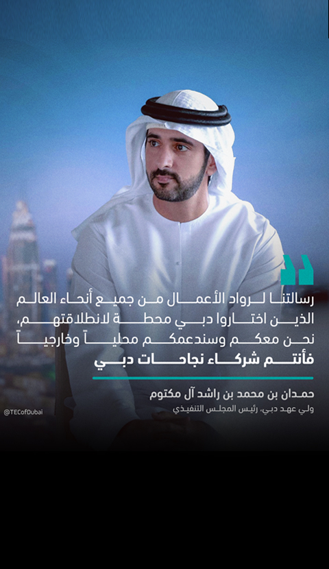 وقال سموه "لقد شهدنا على مدى السنوات الماضية العديد من قصص النجاح للمشاريع والشركات خاصة الصغيرة والمتوسطة في دبي، حتى أصبحت هذه الشركات والمشروعات لاعباً محورياً وحيوياً تحظى بالحصّة الأكبر من الشركات المسجّلة والعاملة في دبي، والتي رفدت اقتصاد دبي بمجالات وقطاعات اقتصادية نوعية قائمة على المعرفة والابتكار، محققة نجاحات وإنجازات ساهمت في ترسيخ مكانة دبي مركزاً عالمياً لتبنّي الأفكار المبتكرة، وبيئةً حاضنةً لأصحاب المواهب والشركات الناشئة والمتوسطة ما أهلها لتصدير نموذجها الريادي للخارج وتوسيع قاعدة اقتصادها المتنوع والمستدام".